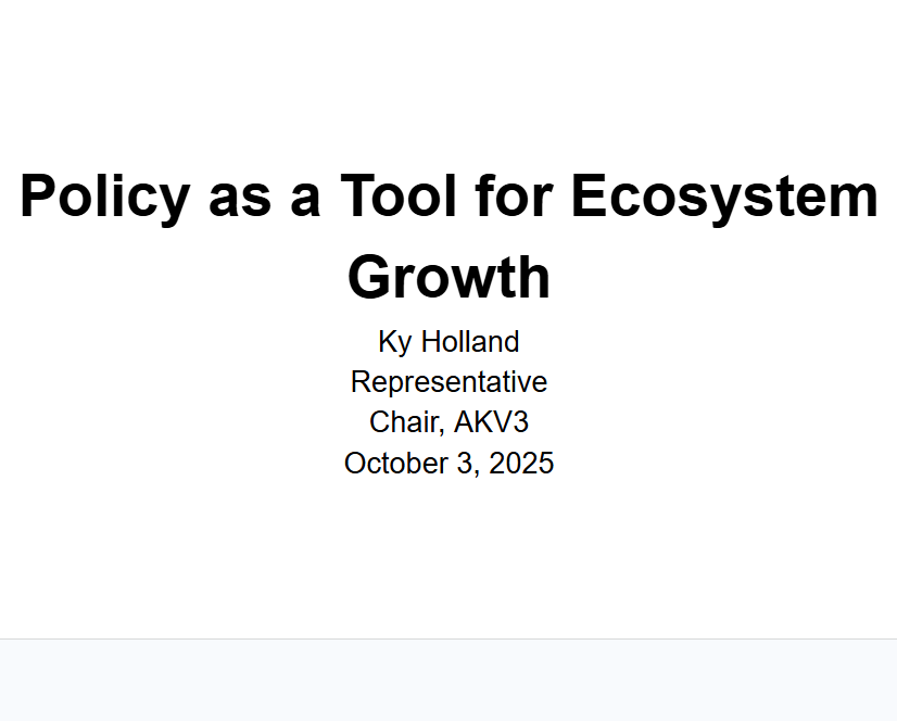 Ky is now representing House District 9 (south Anchorage hillside to Whittier) in the State Legislature. The work of AKV3 has informed the ideas being shared in the legislature, while AKV3 work has slowed. However, some of the bills capture issues from the AKV3 startup community work, including: